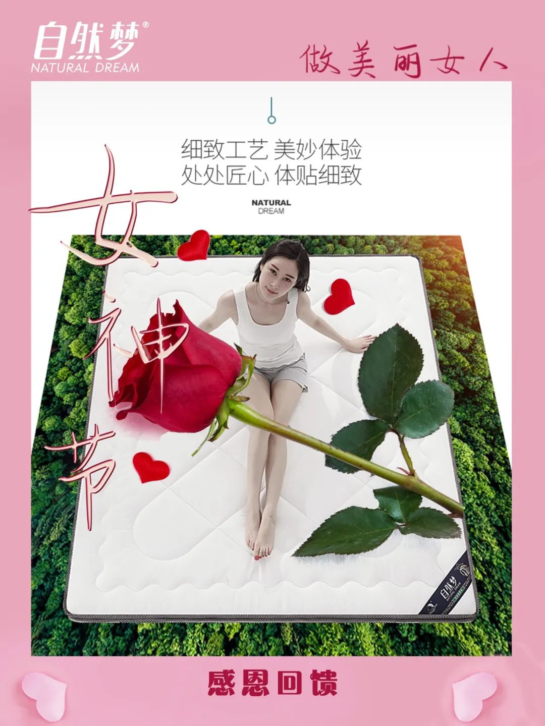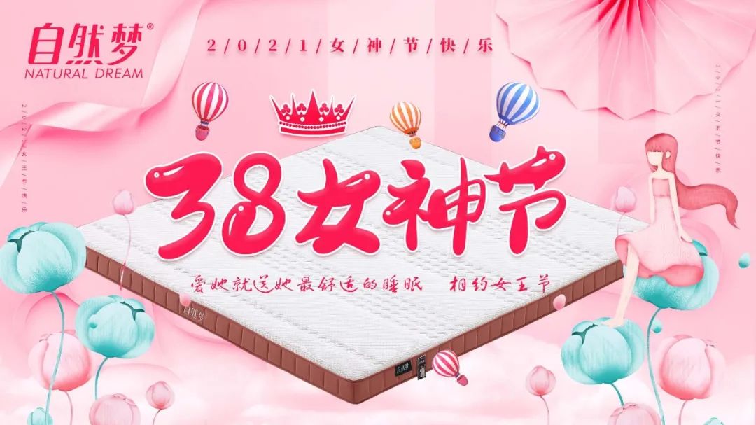 婦女節到了,自然夢棕床墊祝愿你面如芙蓉,嬌艷美麗,容顏俏。富貴逼人,財源旺盛,荷包鼓。福如東海,壽比南山,萬事順。婦女節快樂